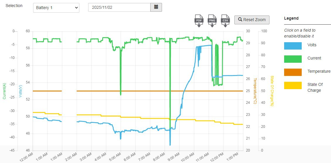 At 11:00 you have a large load happening (increasingly negative current) but in the time before that the voltage is climbing with no effect on current. It's as if the current is only being monitored on the load side (XW or BMS?) and not the charging side (MPPT). Is the MPPT communicating with the XW correctly?