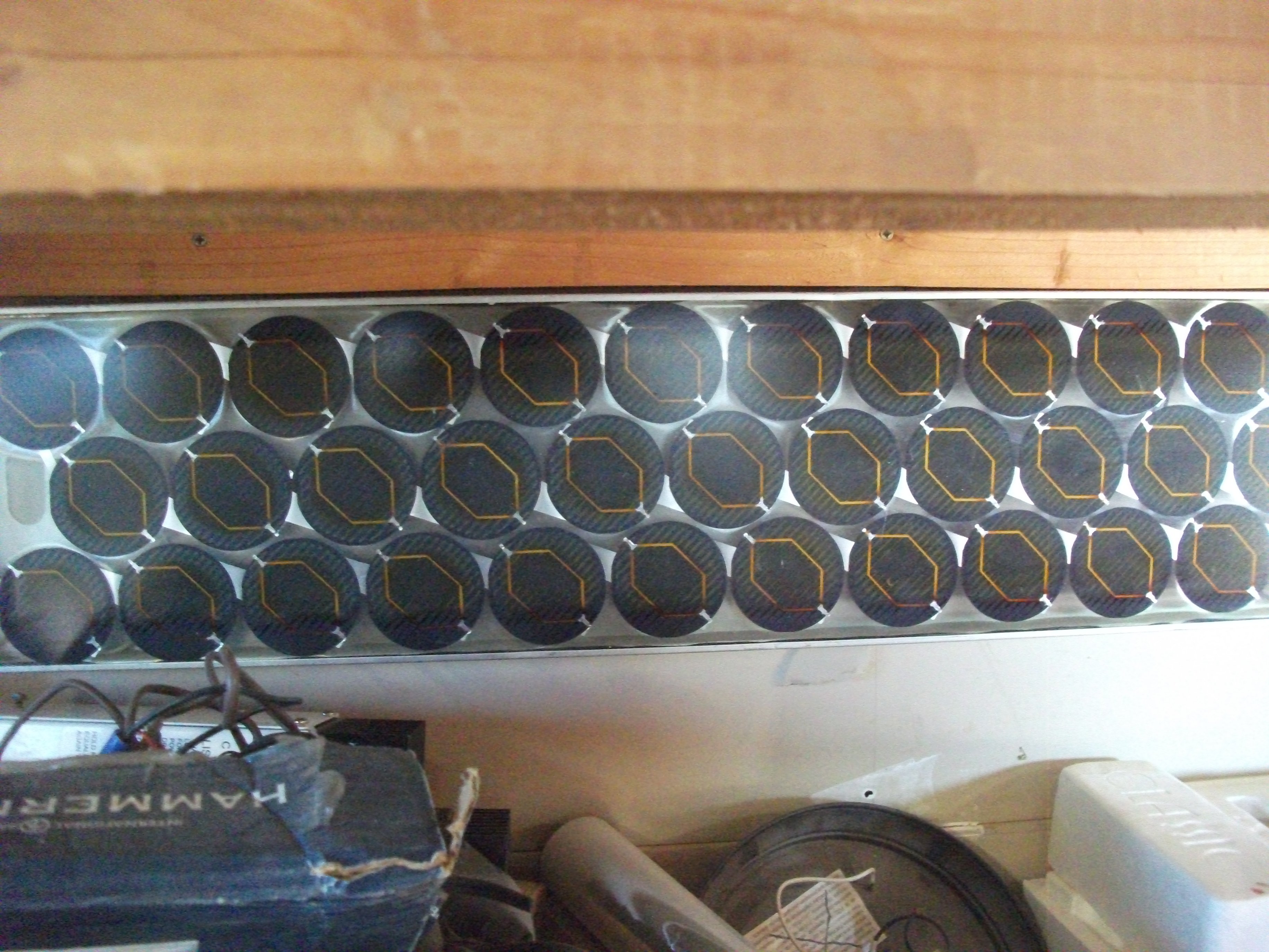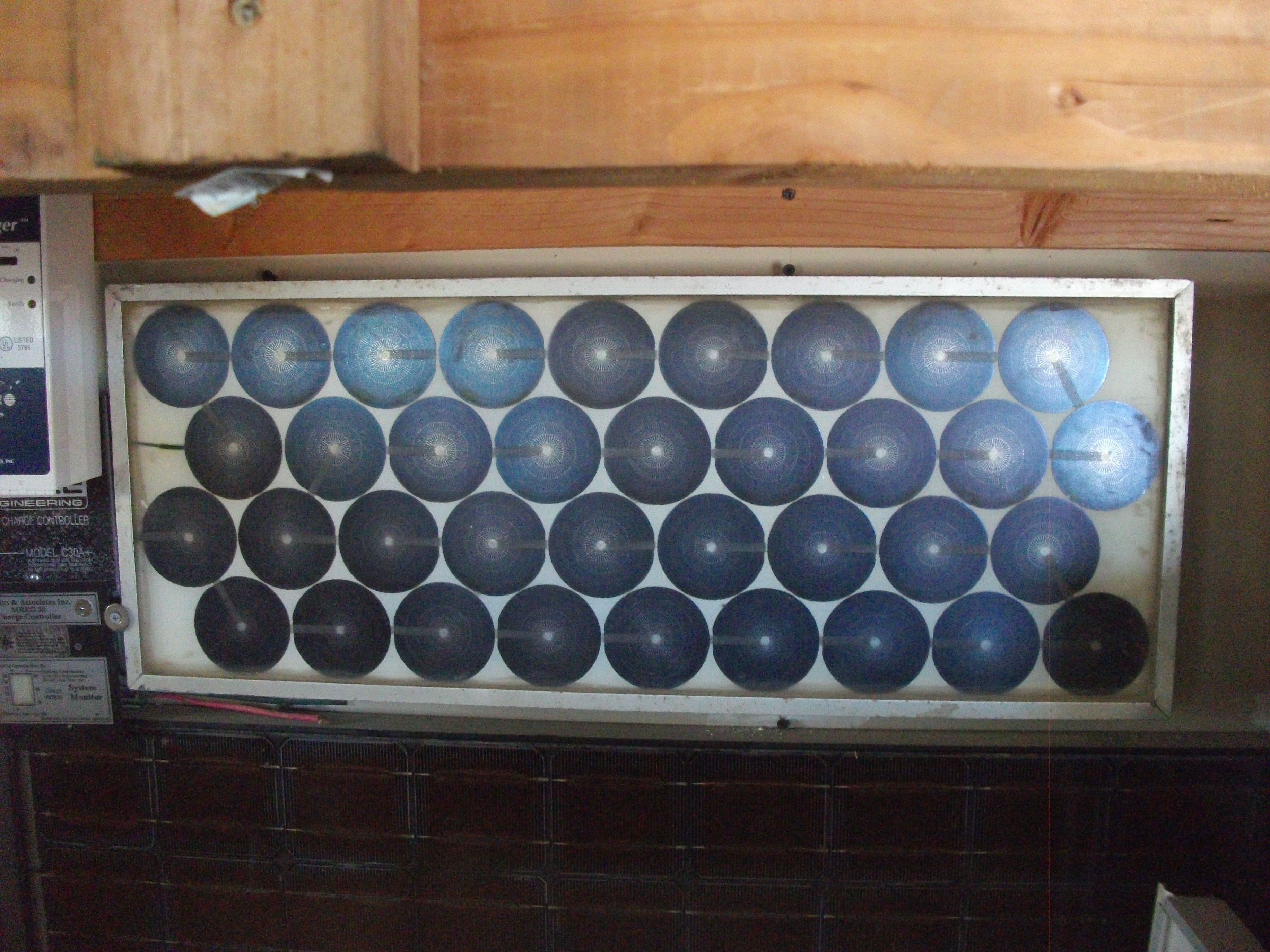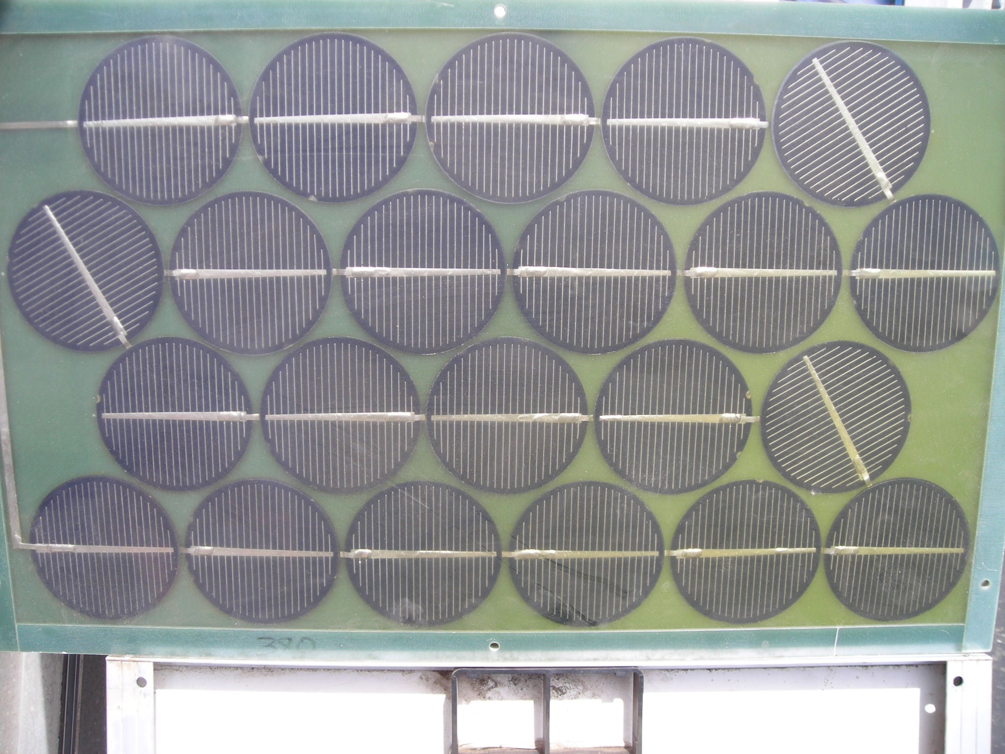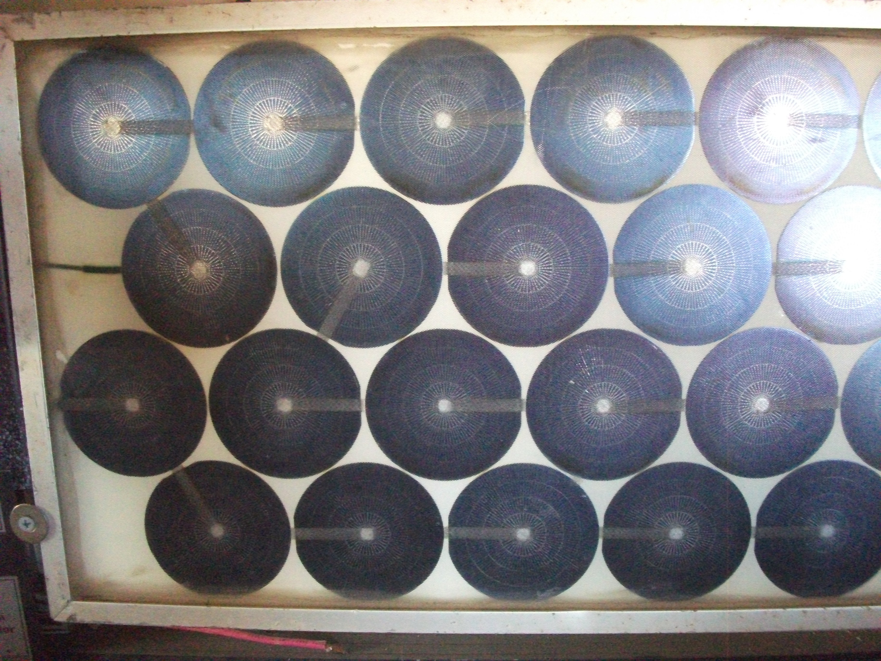 These last three photos show a panel that was made with Surplus cells that were originally Intended for use on satellites. Notice the detail of the traces on the cells, very unique. The cells are about 2 1/2 inches in diameter.
